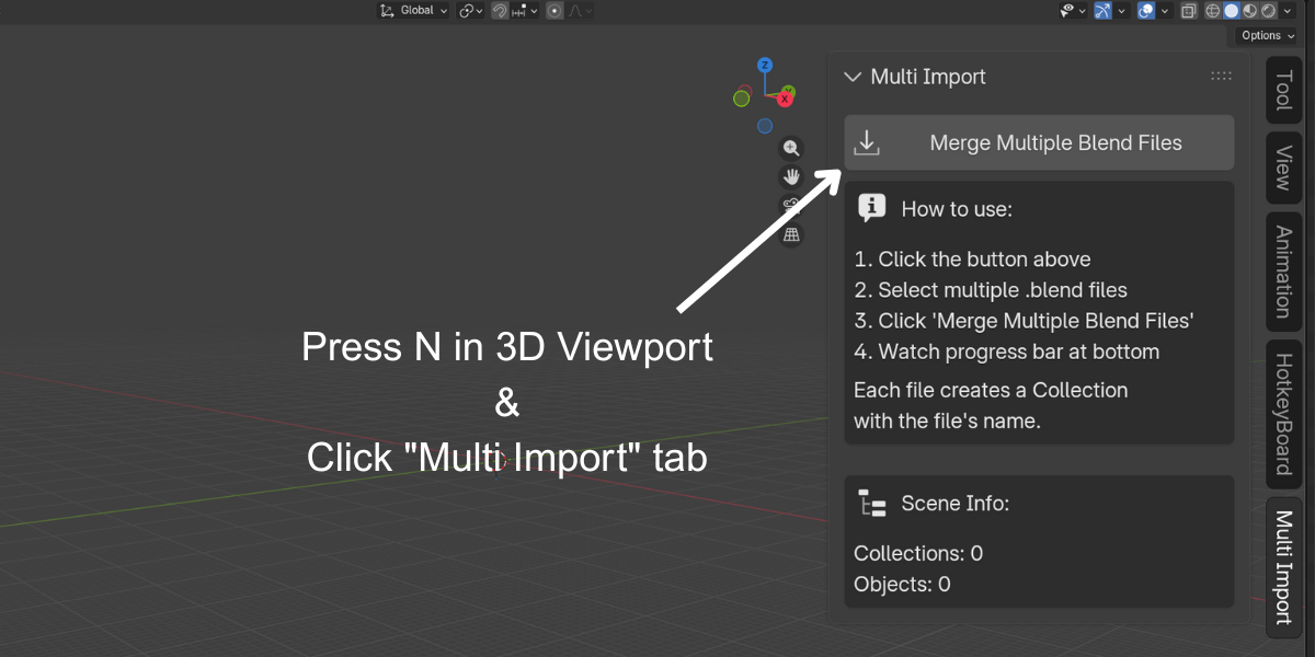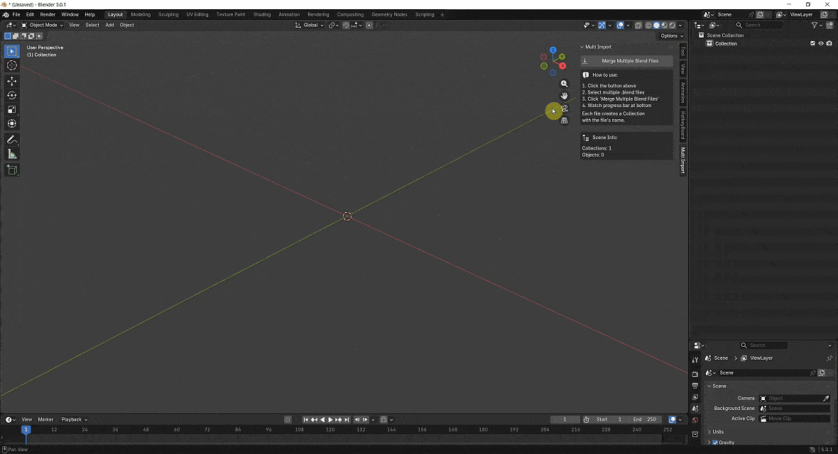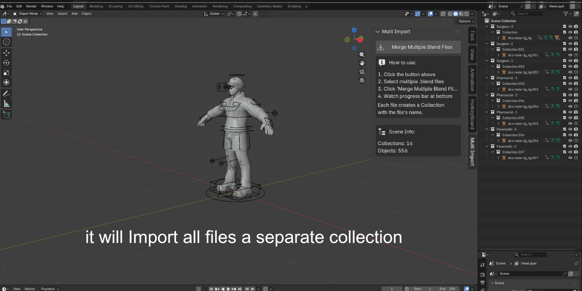 Multi Blend File Merger is a powerful time-saving addon for Blender artists working with large asset libraries, team projects, or modular workflows. Import dozens—even hundreds of .blend files with a single click and watch a live progress bar as everything merges seamlessly into your scene.